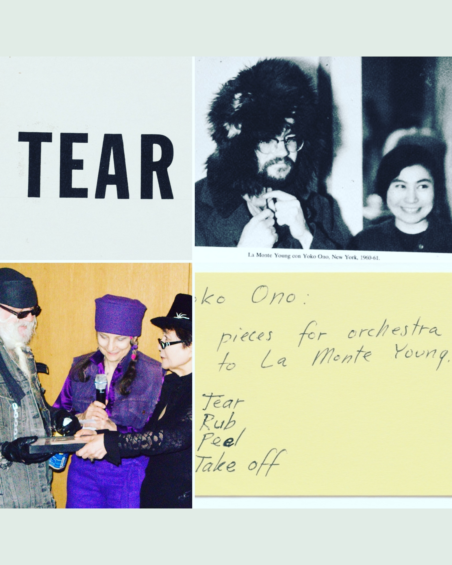 So, in 1960, Ono and Young hosted their first concert loft in her place on Chambers Street, NYC. In the fall of 1960, Young and Ono were experimenting with interactive performances. One example that Hermes gives us is a performance called “Piano Piece of David Tudor #1” while a piano is playing the audience members can bring hay and water to literally feed to the piano.. while its playing!